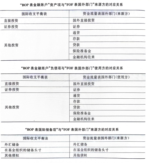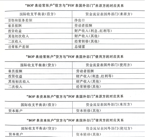 国际收支平衡表与资金流量表的关系主要表现为国际收支项目与资金流量表国外部门的关系。在记录方式上,两者有所不同,国际收支平衡表核算对外交易,站在常住者的角度,而资金流量表核算对外交易站在非常住者的角度。国际收支平衡表(简称BOP表)与资金流量表(简称FOF表)的国外部门在主栏项目上的对应关系如下: