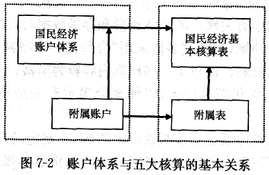 当然,如同任何核算形式一样,账户本身也有它的不足。这主要表现在,一个建立在严格的平衡核算框架之内的账户体系,不可能巨细无遗地完整包容国民经济方方面面、丰富多彩的内容。因此,除了基本的国民经济账户体系之外,往往还需要设置一些附属账表(附属账户或附属表),以便安排和描述国民经济核算和宏观经济分析所必需的其他有关资料(如人口和人力资源核算数据,以及环境与经济综合核算框架等)。这样形成的国民经济核算体系的基本构成关系如图7-2所示。