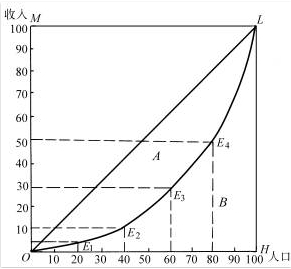 绘制洛伦茨曲线可以直观而形象地表明收人分配的差异程度,但不能给出具体的数值进行比较。进一步用数据说明差异水平就需要计算绝对平均线与洛伦茨曲线之间的面积,从而计算出基尼系数。