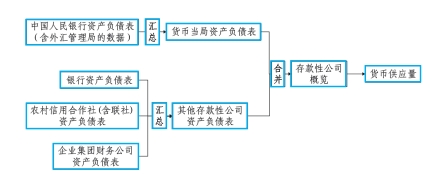 中国货币供应量一般通过两个层次的统计来搜集基础数据(见图1):第一个层次是以金融机构资产负债统计指标的数据为基础,汇总各相关机构的数据,编制资产负债表,主要包括货币当局资产负债表、其他存款性公司资产负债表;第二个层次是编制概览表,将货币当局资产负债表和其他存款性公司资产负债表进行合并编制存款性公司概览。存款性公司概览中的货币与准货币即是货币供应量的数据。