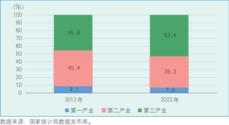 图1 2012年、2022年三次产业增加值占国内生产总值的比重
