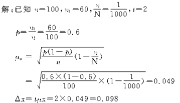 【例题1】某城市采用不重复方法随机抽选了100户居民,经调查其中有60户拥有彩电,又知道抽样数是全市居民户的千分之一,当概率度为2时,试计算抽样平均误差和抽样极限误差。