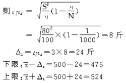 【例题2】某地区进行农产量抽样调查,按不重复方法,随机抽选了100亩小麦耕地,测得平均亩产量为500斤,标准差为80斤,又知道抽样数是小麦耕地的千分之一,当可靠程度为99.73%时,试估计该地区小麦平均亩产量的变化范围。