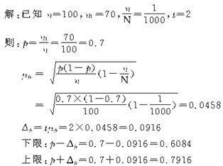 【例题3】某城市按不重复方法随机抽选了100户居民,经调查其中有70户拥有彩电,又知道抽样数是全部居民户的千分之一,当可靠程度为95.45%时,试估计城市居民拥有彩电的户数所占的比重范围。