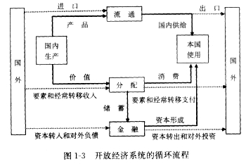 (2)将对外经济往来引入国民经济循环。国民经济是一个开放的系统,各国经济彼此间存在广泛联系,并通过各种对外经济往来和资产负债关系表现出来。一国的对外经济关系不仅影响到国内的市场供需和资金余缺状况,而且影响到该国的国际经济和政治地位,因此也必须引入国民经济循环的分析框架(图1-3)。