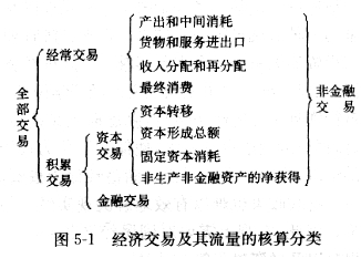 1993年SNA将全部经济交易按其对象性质不同划分为四类:①货物与服务交易(P类'又称产品交易),这是指发生在生产者、消费者和投资者之间的货物或服务的销售、购买等经济行为,如消费支出、投资支出,以及货物与服务的进、出口等。②分配和资本转移交易(D类),包括收入的初次分配和再分配,以及资本转移。③金融交易(F类),这是指金融资产的净购买或负债的净发生,包括通货、股票、债券、应收应付款等流量。④其他积累交易,这是指上面未包括的特殊交易,主要有固定资本消耗、非生产非金融资产获得和处置;但要注意的是,在SNA的全部经济流量分类中,该类交易是与非交易的积累流量合并在一起的,统称为“其他积累流量(K类)”。