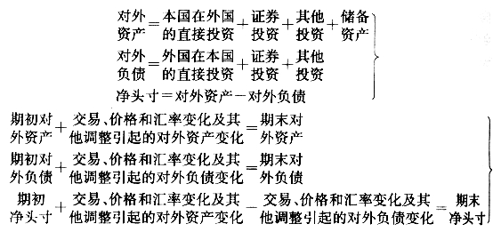 国际头寸核算与国际收支核算是紧密联系,互相补充的,换言之,它们就是对外经济领域的存量和流量核算。在第五章中,我们通过国际收支平衡表对一国在一定时期内所发生的各种国际收支活动进行了核算。本节我们将以此为基础,对际收支平衡表所没有涉及的其他内容加以核算,包括一定时点上一国的对外资产负债状况以及一定时期内由于汇率变动等非交易因素所引起的对外资产负债变动的情况等。这些就是国际头寸核算所要回答的主要问题。