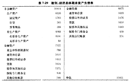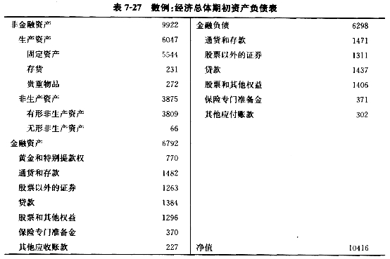 在国民经济账户体系中,资产负债表首先是分部门编制的,综合各部门的资产负债表就得到国民经济总体的资产负债表。与金融账户相类似,在综合国内各部门之间(或常住经济单位内部)的金融资产与对应的负债存量时,为了反映金融市场和资产负债的总体规模,保存较为完整的基础核算数据,通常也是采用“加总”的方法来处理那些内部的金融资产与负债存量。当然,这并不排除在专门进行有关国民财富的核算与分析时,也可以运用“合并”的方法将内部金融资产与负债存量相互抵消。采用“加总”方法编制的经济总体资产负债表如表7-27、表7-28和表7-29所示。