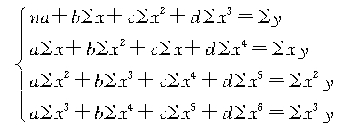 解此标准方程组,可分别求出二次曲线方程的参数a,b,c。为简便起见,可令Σx=0,Σx3=0,则上式可简化为: