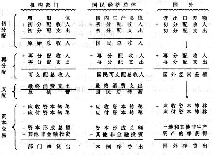 从国内生产总值开始,通过与国外之间的收入初次分配,得到国民总收入;又通过与国外之间的收入再分配,得到国民可支配收入;然后由各有关部门(住户、政府和非营利机构)进行消费。国民可支配收入扣除国民消费支出,余下的部分即为国民储蓄,它是国民经济总体的经常交易差额或经常结余(注意这不是国际收支平衡表上的经常差额);再通过与国外之间发生的资本转移,就形成国民经济总体从事金融和非金融投资的全部自有资金来源,这同时也将最终影响到经济总体的资产负债表上净值的变化。在进行了资本形成和其他非金融投资之后,整个经济总体可能出现资金剩余,形成对国外的净贷出,也可能出现资金短缺,引起从国外的净借入。