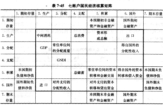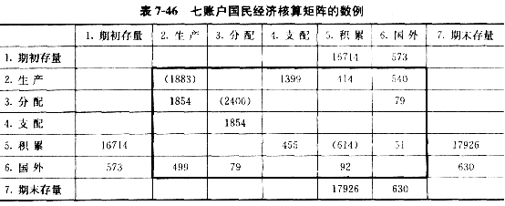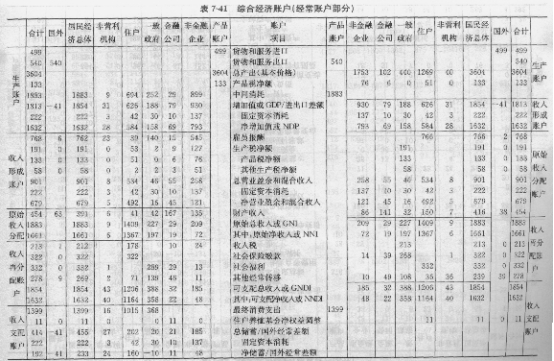 实际上,在表2-10和表7-44中,由于尚未区分生产账户与产品账户,也未引入部门分类,故国民经济诸账户均未考虑部门间的内部流量循环(包括中间消耗流量、收入分配流量、资本转移流量和金融流量等),而只反映了本国与国外之间的外部流量循环以及再生产各环节之间的总量循环;此外,也没有单独显示固定资本消耗及其对增加值(GDP)、可支配收入、储蓄和资本形成等指标的影响。显然,这还只是一种高度简化的处理方式。但是,由于国民核算矩阵所独具的便于扩充和分解的长处,有关的纽节问题都可以在已有的表式框架基础上逐步地给予补充。随着国民核算矩阵的适当展开,其中蕴涵着丰富经济内容的部门间流量将被发掘出来;国民核算矩阵还为充分表达这些部门间流量提供了极为简洁有效的形式,也为运用经济数学模型和现代计算手段处理国民核算资料提供了基础和便利。