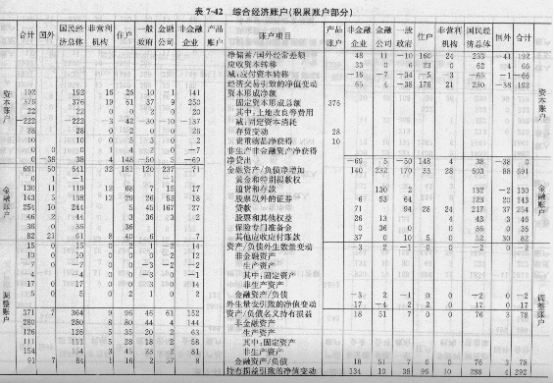 在形如表7-48的国民经济核算矩阵中,有关经济交易的诸账户(包括经济总体账户和国外账户)无疑构成了全表的核心部分,其中的每项数据都可以按“行贷列借”的规则作双重理解;循着这种纵横交错的流向线,我们可以顺次观察国民经济领域内的各种交易和流量循环过程,以及由此形成的多样而又复杂的核算关系。