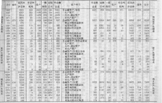 但是,其余部分(调整账户和存量账户)由于采用了特殊的安排方式,故在核算形式上并不具备非常严谨的特点;尽管如此,它却能够将有关资产负债流量与存量的衔接关系既简洁又直观地表达出来。譬如,对于国民经济总体,容易看出:
