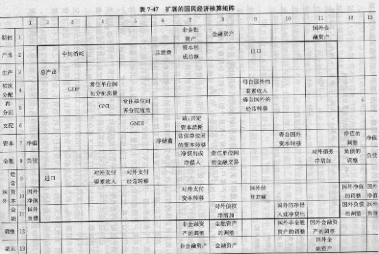 倘若我们对上述的7阶国民核算矩阵施行必要的变换处理:首先,将生产账户划分为产品账户和生产账户;其次,将分配账户划分为初次分配账户和再分配账户;再次,将积累账户划分为资本账户、金融账户,并补充反映非交易因素影响内容的调整账户;最后,将国外账户划分为四个账户,即国外经常账户、资本账户、金融账户和调整账户。这样,就得到一AI扩展的13阶国民核算矩阵(表7-47)a除了增加矩阵表的行列之外,容易看出,账户分解的另一个结果是显示了一些重要的平衡项,如经济总体的国民总收入和净贷出,以及国外的经常差额和净借入等。