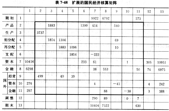 在表7-47中,我们之所以要将经济总体的调整账户和国外的调整账户都从积累账户中拿出来,再一并安排在专门反映交易流量账户内容的方框之外,也是考虑到这些账户所描述的资产负债外生数量变动和持有损益与其他积累账户之间不存在借贷对应关系,故采用了类似于处理资产负债存量的方式。这样做,一则节省了表格的篇幅,再者也便于在表中直接观察期初与期末之间的资产负债变动、衔接关系。总的说;在这样构造的国民经济核算矩阵中,有关经济交易的各种流量账户都被安排在第2—11行与第2~11列交叉部分的方框之内(表中以粗线突出显示),其中的每一非零元素既是所在列账户的借方项目,又是所在行账户的贷方项目,它们具有双重含义。而方框之外的资产负债调整项目或存量项目,尽管也是按“行贷列借”的规则来安排的,但它们与所在行(或列)的资本、金融账户之间并不存在借贷对应关系,只是借用了这些行列中的空余位置,因而需要相对独立地加以理解。