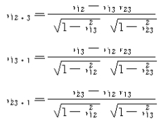例如,变量x1、x2、x3之间彼此存在相关关系,为了衡量x1和x2之间的相关关系,就要让x3保持不变,计算x1和x2的偏相关系数,用符号r12·3表示。同理r13·2表示当x2保持不变时,x1和x3的相关系数,r23·1表示当x1保持不变时,x2和x3的相关系数。其计算公式如下: