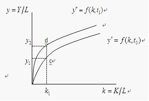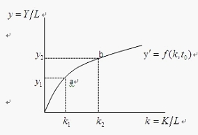 图8-1的纵轴表示人均收入或人均产出,横轴表示人均资本。假定资本K以外的所有生产要素的投入量均不变,只有投入要素K是可变的,即人均产出仅仅是资本的函数。图8-1(1)中,在t0期,不存在技术进步,人均产出曲线为