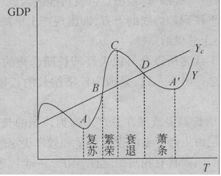 点表示一国的经济运行正处于周期的低谷,C点则表示一国经济运行正处在周期的波峰,在B点和D点,经济运行正处在趋势线上。从A点到B点为复苏阶段,从B点到G点为繁荣阶段,从C点到D点为衰退阶段,从D点到A,点为萧条阶段。也可以把从A点到C点看成是一国经济增长的景气上升阶段,把从C点到A,点视为景气下降阶段。计算周期的长度可以从波谷到波谷,即从A到