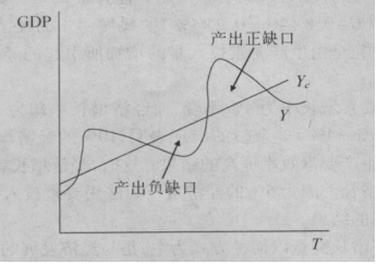 图8-2中,纵轴表示产出水平,横轴表示以年为单位的时间。坐标中的曲线(y线)即为实际经济运行曲线,曲线上的任意一点都表示一个国家在某一时期的实际总产出,坐标中的直线(yc线)为长期经济增长趋势线,线上任意一点都表示一个国家在一定时期的潜在产出水平。当实际产出水平高于潜在产出水平时,经济中存在着一个产出正缺口,而当实际产出水平低于潜在产出水平时,经济中则存在着一个产出负缺口。